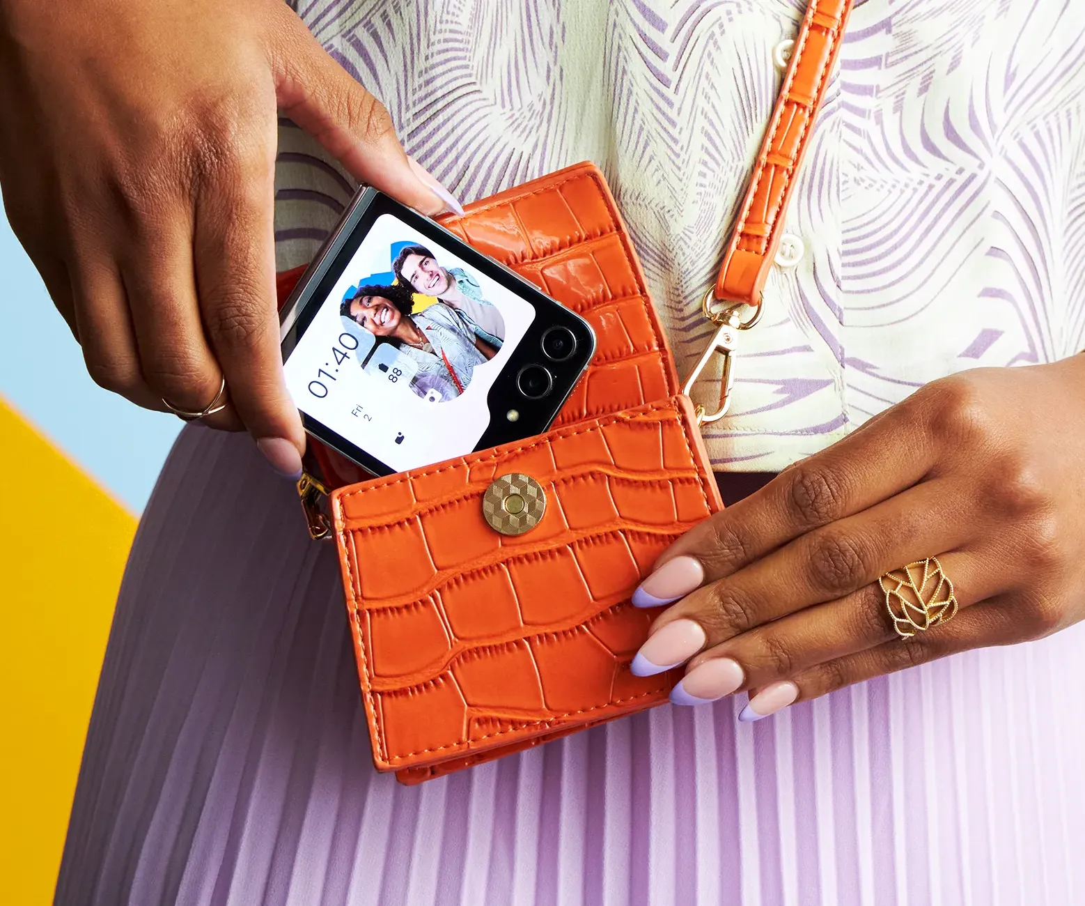 To lay the foundation, we crafted distinct character archetypes for each device, keeping in mind the target audience. The Z Flip, tailored to a slightly younger Gen Z demographic, featured an influencer and a fashionista, while the Z Fold, designed for millennials, showcased an art director and a businessman. Environments and sets were aspirational, keeping with the premium theme of the devices. One creative standout was a custom mural backdrop that I designed for the Z Flip scenes. It incorporates the device and Samsung palette and a graphic look with feature callouts.